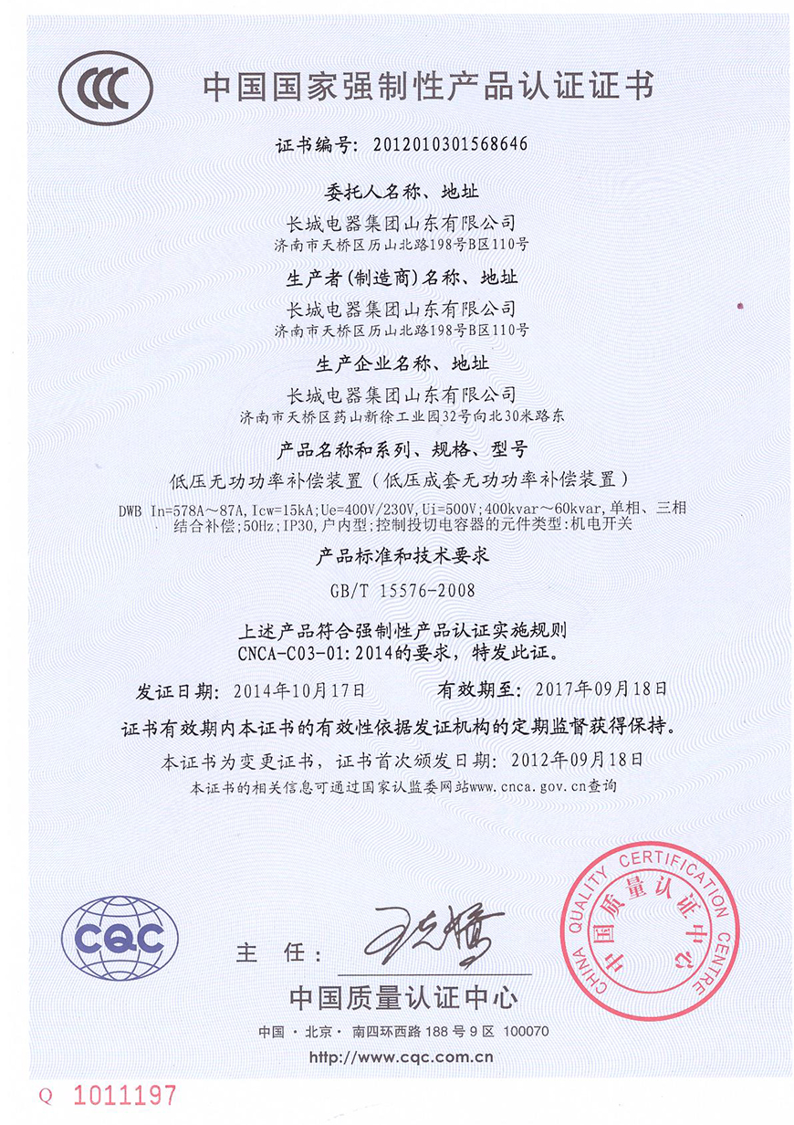 - 熱烈慶?!伴L城電器集團山東有限公司”榮獲“ISO9001質(zhì)量管理體系證書[2017-01-04]