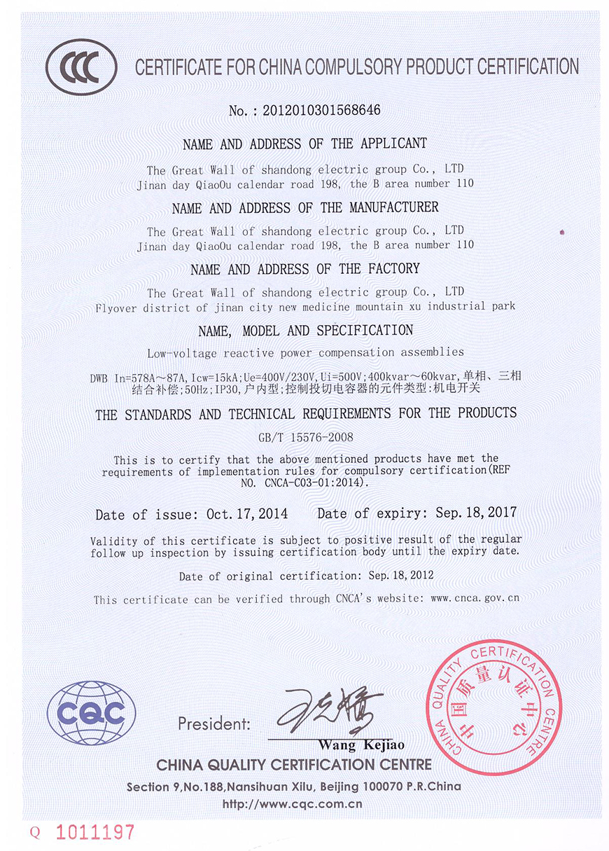 - 熱烈慶?!伴L(zhǎng)城電器集團(tuán)山東有限公司”榮獲“ISO9001質(zhì)量管理體系證書[2017-01-04]