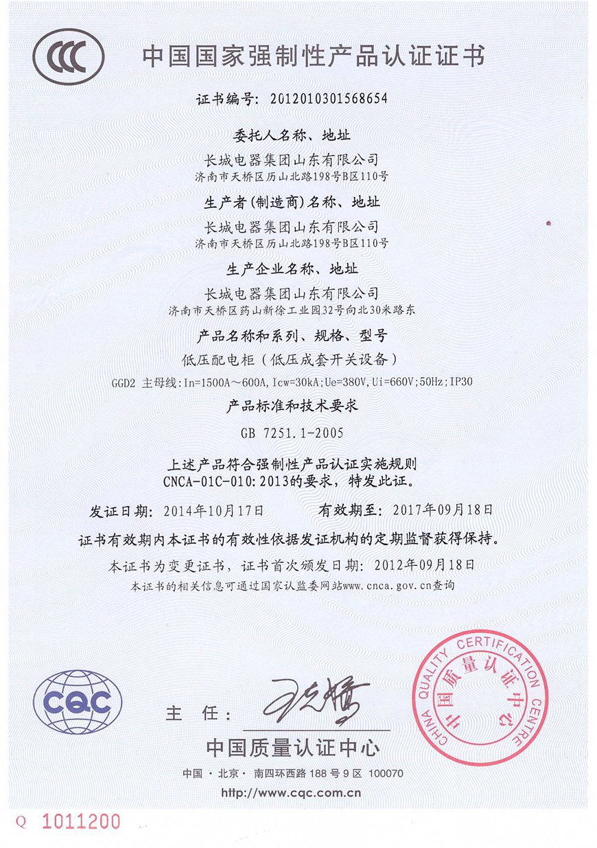 • 熱烈慶?!伴L城電器集團(tuán)山東有限公司”榮獲“ISO9001質(zhì)量管理體系證書[2017-01-04]