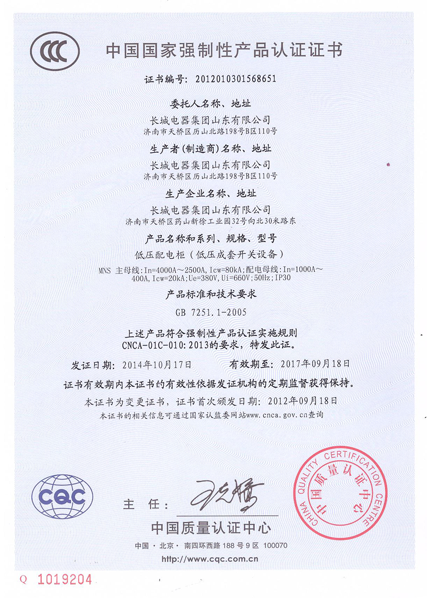 • 熱烈慶?!伴L城電器集團(tuán)山東有限公司”榮獲“ISO9001質(zhì)量管理體系證書[2017-01-04]