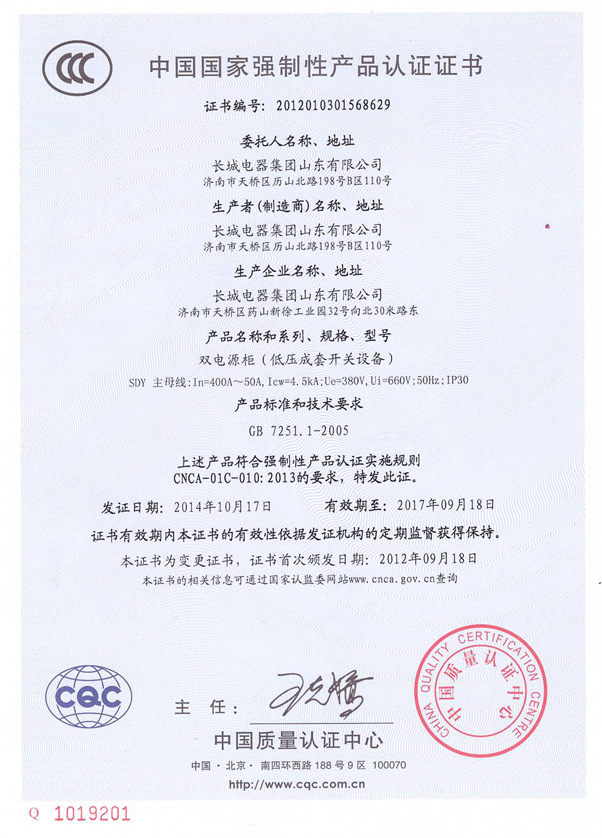• 熱烈慶?!伴L城電器集團(tuán)山東有限公司”榮獲“ISO9001質(zhì)量管理體系證書[2017-01-04]
