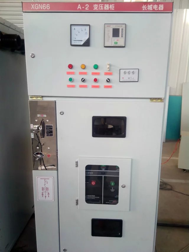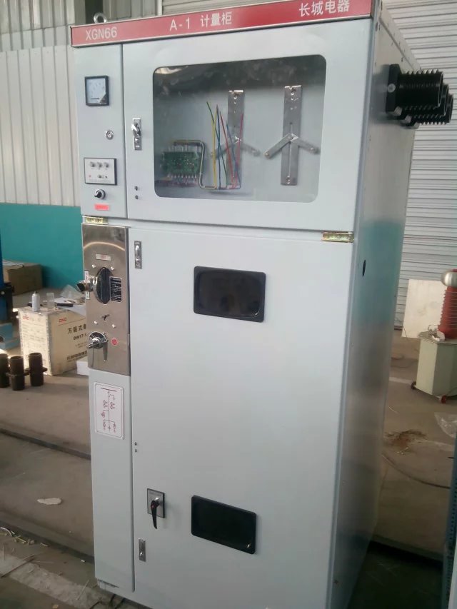 XGN66型開關(guān)柜為金屬封閉箱式外殼,所有帶電體均被封閉在柜內(nèi),并按功能劃分為母線室、斷路器室、電纜室,室間以金屬防護(hù)板分隔。儀表箱為單獨結(jié)構(gòu),安裝在柜上部,轉(zhuǎn)動箱后的絲杠,可使其升高300mm,以便于檢修斷路器部分。主母線由柜間的絕緣套管固定,卸下后蓋板即可檢修,此套管使相鄰兩柜間完全隔離,母線室頂蓋板上設(shè)有釋壓窗。真空斷路器及電磁操作機構(gòu)或彈簧操作機構(gòu)為一整體車式結(jié)構(gòu),推入柜內(nèi)后用螺栓固定。斷路器室與主母線室之間安裝上隔離開關(guān),與電纜室之間安裝下隔離開關(guān)。斷路器室的后壁安裝電流互感器,右側(cè)設(shè)有上下隔離開關(guān)及其接地開關(guān)的操動機構(gòu),本室內(nèi)如產(chǎn)生過高壓力,可經(jīng)后上方的釋壓窗排出。電纜由柜底板下部的支架和卡箍固定,穿過零序互感器進(jìn)入柜內(nèi),用蓋板及填充物封嚴(yán)。電纜室高度900mm,可安裝三根240mm的電纜,電纜芯線連接到匯流銅排上,這個銅排用帶電顯示裝置的傳感器支撐,可以檢查電纜是否帶電。電纜室內(nèi)根據(jù)需要可以安裝避雷器,后下方設(shè)有接地母線,右下方是電纜頭接地開關(guān)的操作機構(gòu)。本室內(nèi)如產(chǎn)生過高壓力,可經(jīng)后部通道由上部的釋壓窗排出??諗嗦菲鞑捎锰沾蓺ら_關(guān)管,其外表面為波紋狀,爬電距離在210mm以上。相間中心距為230mm,空氣電氣間隙在125mm以上,電磁操作機構(gòu)采用半軸脫扣式四連桿機構(gòu),以直流電源驅(qū)動電磁鐵實現(xiàn)合閘、分閘。彈簧操作機構(gòu)是按引進(jìn)比利時EIB公司技術(shù)生產(chǎn)的,以直流或交流電源驅(qū)動電動機使彈簧儲能,然后以電磁鐵使彈簧釋能,實現(xiàn)合閘,再以電磁鐵使機構(gòu)脫扣,實現(xiàn)分閘。上隔離開關(guān)采用GN30型旋轉(zhuǎn)式隔離開關(guān),附有接地刀。下隔離開關(guān)采用GN24型,附有接地刀。相間中心距均為230mm,所用電瓷件爬電距離均在210mm以上。